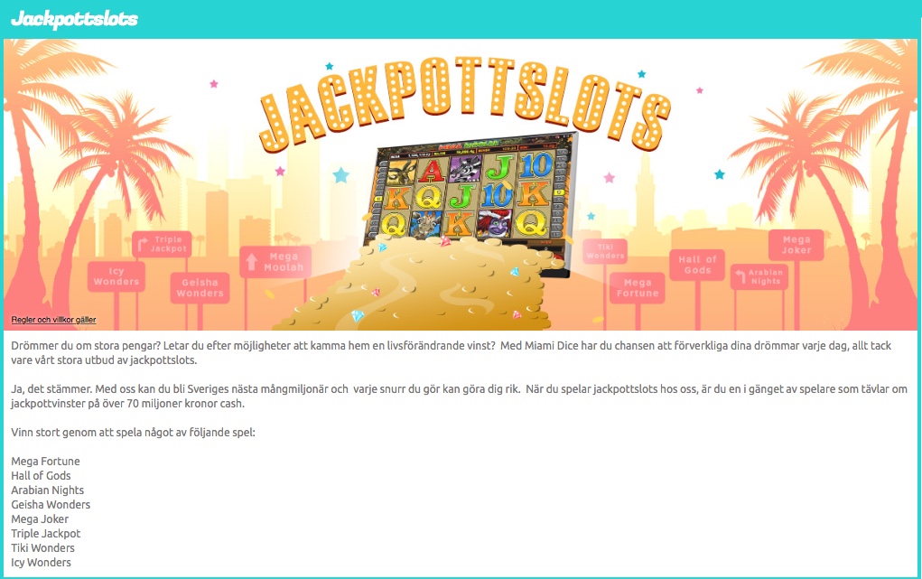 Gillar du att spela på Jackpotslots, då ska du spela på Miami Dice som har ett stort utbud av jackpotsspel. Du kan hitta dessa spel: Mega fortune, Hall of gods, Arabian nights, Geisha wonders, Mega Joker, Triple Jackpot, Tiki wonders och Icy wonders.