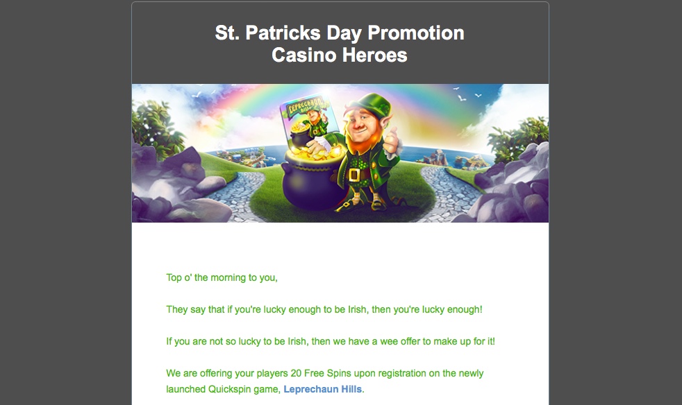 Saint Patricks day erbjudande. Få 20 freespins på Leprechaun Hills när du registrerar dig på Casino Heros, ingen isättning krävs. erbjudandet gäller mellan 16 -19.e mars.